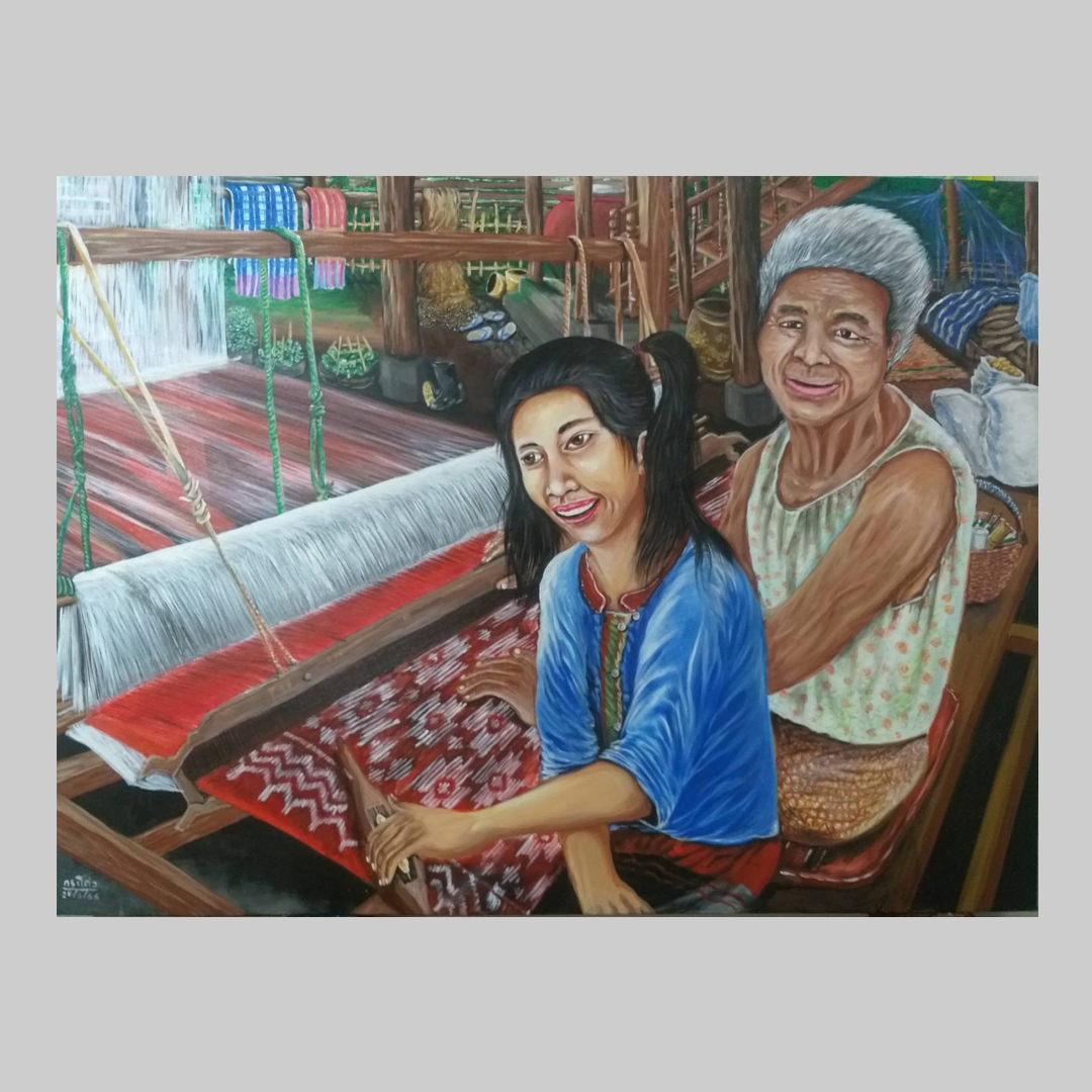 แนวคิด: ภาพความทรงจำวัยเด็ก ช่วงเวลาสุดสัปดาห์พ่อแม่มักจะหาไปเยี่ยมตายายเสมอ สิ่งที่เห็นเสมอและเป็นภาพติดตาคือภาพของการปั่นฝ้ายกาทำผ้าห่มนวม และที่จำได้อีกอย่างคือภาพการทอผ้ากี่กระตุกข้างบ้านยาย จำไม่ได้ว่าที่บ้านยายมีกี่กระตุกหรือป่าว…แต่ภาพคนแก่ทอผ้าก็ยังคงเป็นภาพติดตาเสมอมา
